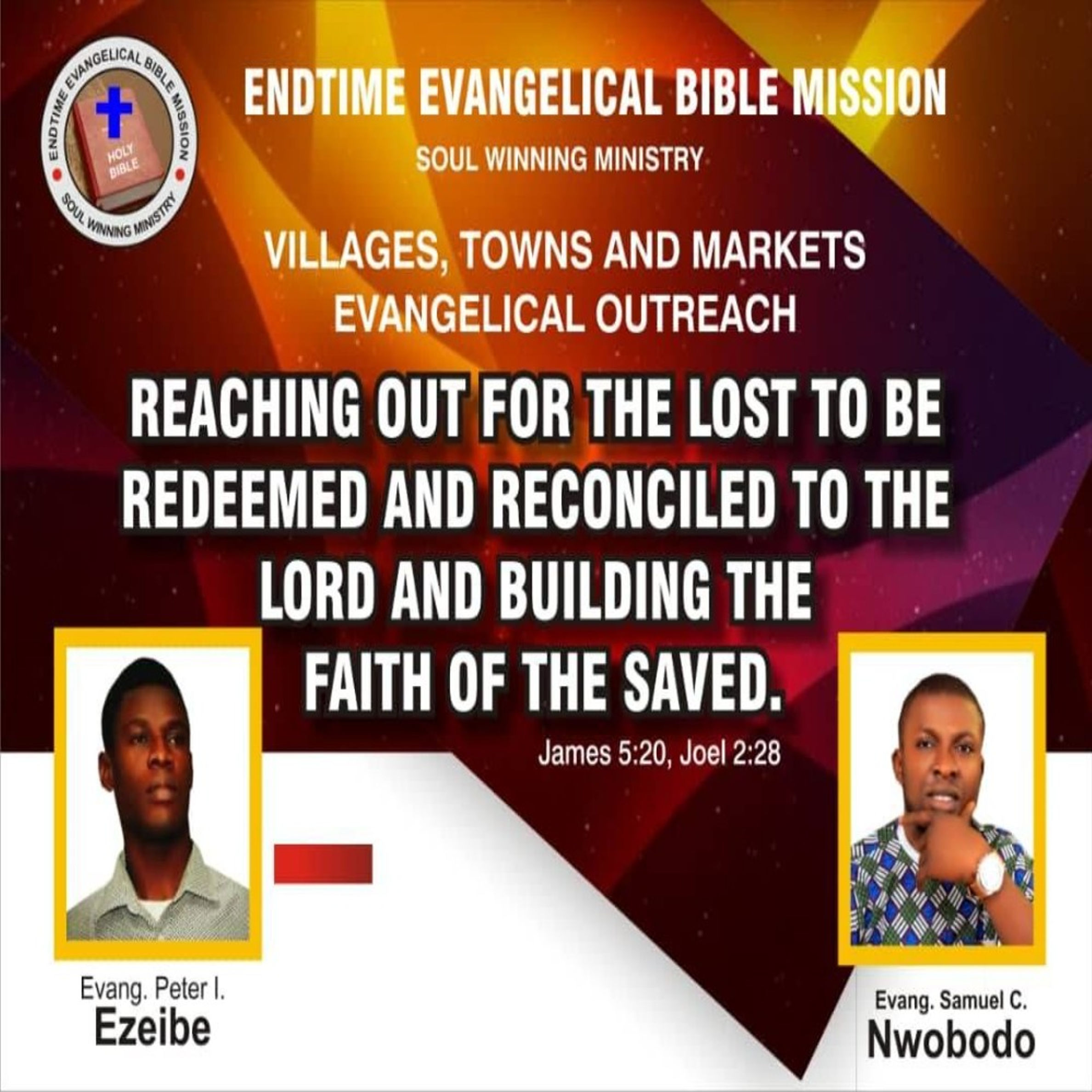 - Greetings Brethren in Christ…Be part of God’s mission in Soul winning. Endtime evangelical bible mission. (Souls winning ministry) Is a Non – denominational Evangelical Ministry Divinely Assigned by God these Endtime for souls winning and Revival. ( James 5:20 Joel 2:28 ) I’m are raising money for mission outreach evangelism in villages, towns streets / markets